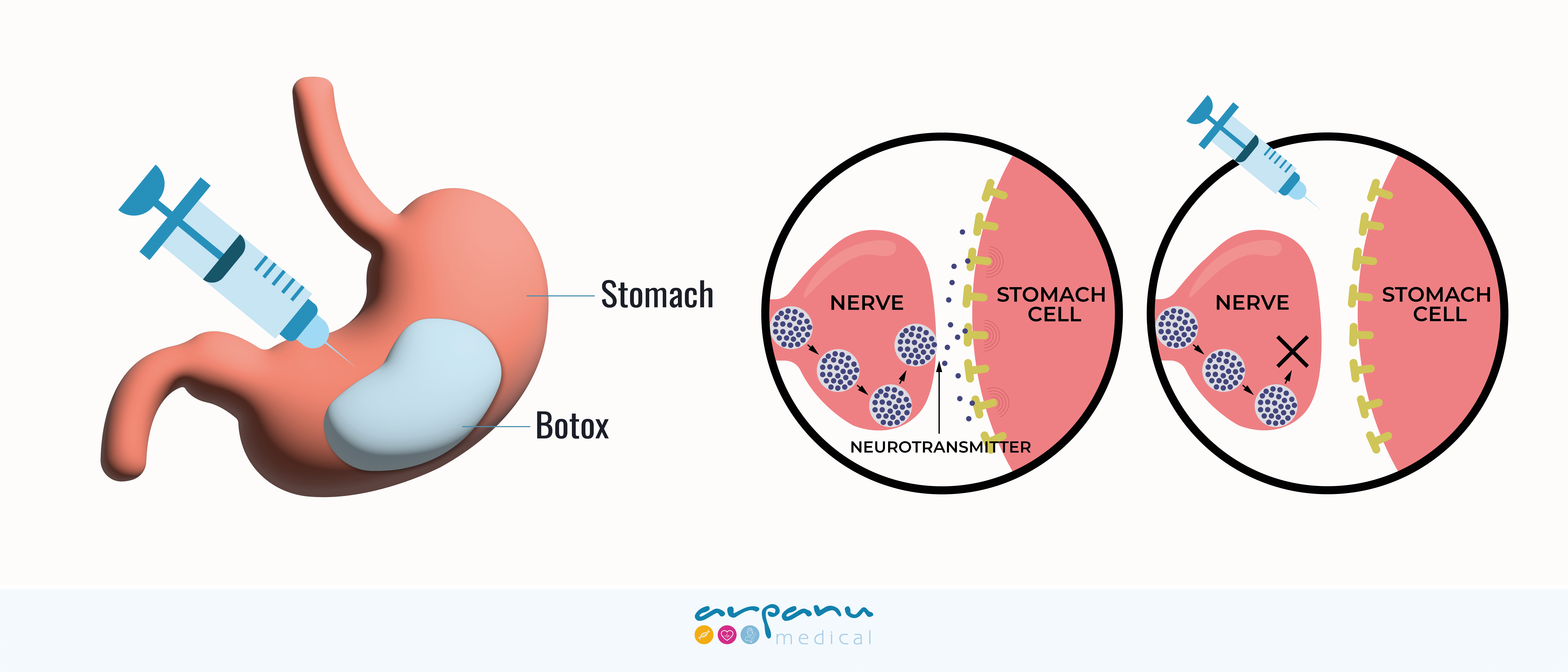Gastric Botox works by administering Botox injections into specified regions of the stomach wall to block muscle contraction, which will help slow down the digestive process (also known as gastric emptying) and stomach motility. This will extend the feeling of fullness experienced after eating food that will cause a decrease in appetite; reducing the overall amount of food intake and facilitating weight loss within time.